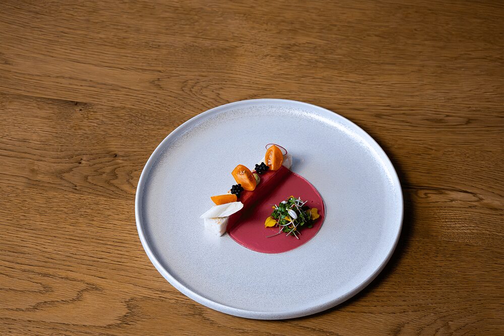 ズワイ蟹のガトースタイルアブリューガキャビアビーツのクリスタルフィルムとマイクロリーフアボカドピュレ