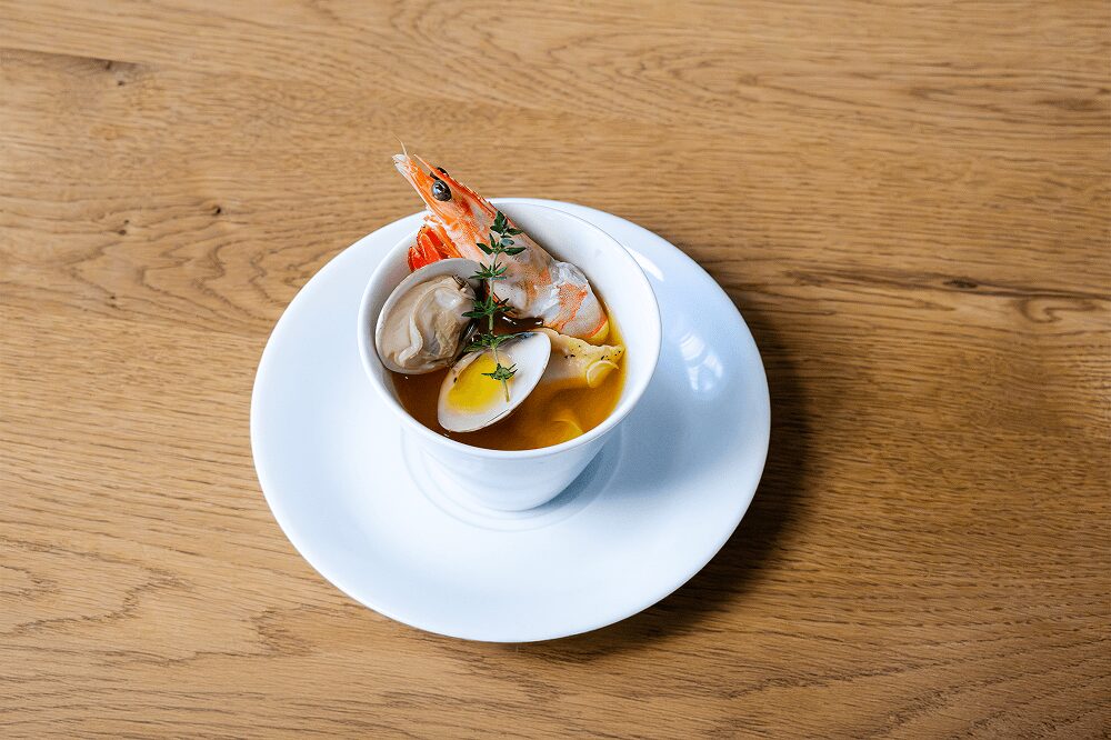 那須御用卵のロワイヤルブイヤベース仕立て(海老、蛤、つぶ貝 タイム)