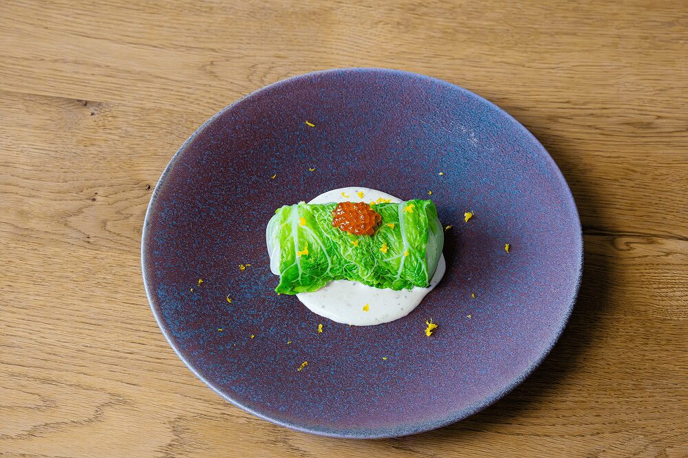 特産干瓢と銀鱈のルーロー粒マスタードのクリームソースいくら添え柚子の香