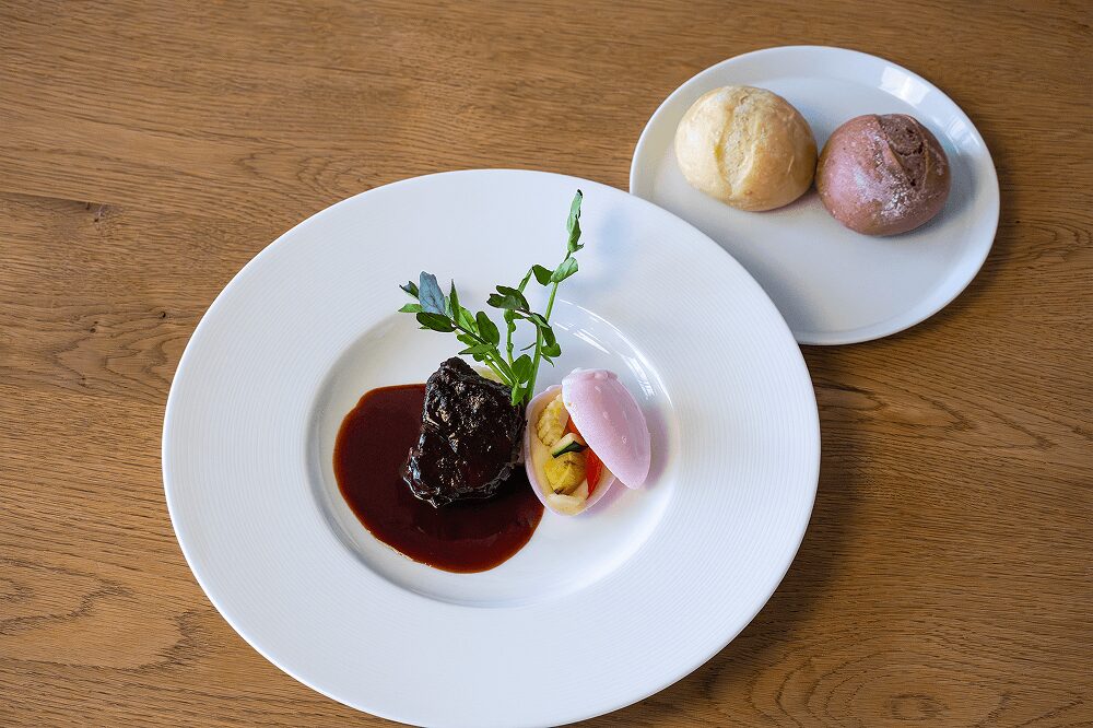 栃木県産とちおとめ牛モモ肉のブルギニヨンポムピュレと野菜を詰めたイチゴの最中